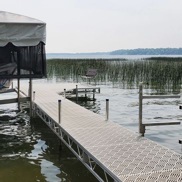 JB Lund’s Roll-In Dock system boast a lightweight classic design, and provides the ultimate ease going in and coming out of the water. Sturdy aluminum trusses with cross members every 12″ and 2 3/8” OD aluminum legs or optional screw legs mean your dock won’t shift or flex. Removable 4×4 foot decking panels allow you to match your dock to your needs and environment.